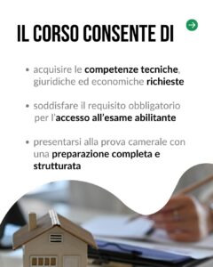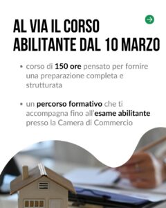 Il percorso, della durata complessiva di 150 ore, è progettato per fornire ai partecipanti una preparazione solida e strutturata, necessaria per affrontare con successo l’esame abilitante in Camera di Commercio. Grazie a questo corso gli aspiranti agenti potranno acquisire le competenze tecniche, giuridiche ed economiche indispensabili per operare professionalmente nel mercato immobiliare.